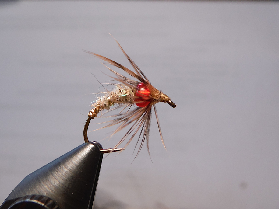 Yes, there’s a hair outta place and the thread head isn’t so neat but… you get the idea. This is a size 12 Orvis hook – a 1639 – Down eye, 1X Fine, 1X Short Shank. The gold tag and rib I used was fine oval gold tinsel. Bead was from JoAnne’s Fabric shop, a 8/0 Czech glass ‘seedbeads’, ruby in color. Dubbing was a mix of Hare’s Ear(HE) Krystal Dub and HE Ice Dub. I laid down 4 or 5 turns of flattened 0.020″ lead under the dubbing. Finally, I used Whiting Brahma Hen for the hackle. I’m sure a grouse or partridge could be used and might be in the original recipe.