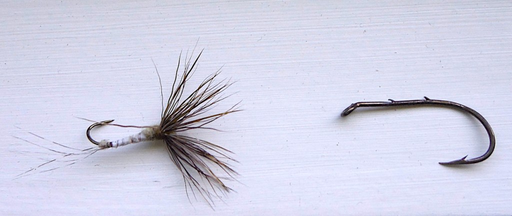 The fly has yellowish hints of color in the deer hair that doesn’t show up in the picture very well. And I’m pretty sure this was tied as a split wing fly. Looks like a quill body too. The hook, needs no introduction. With barbs on the hook shank, its a bait hook. Quite legal here where I’ve been fishing. But this fish had both of these in its mouth when I caught it. I wonder if the fly fisherman had landed the fish before I did?