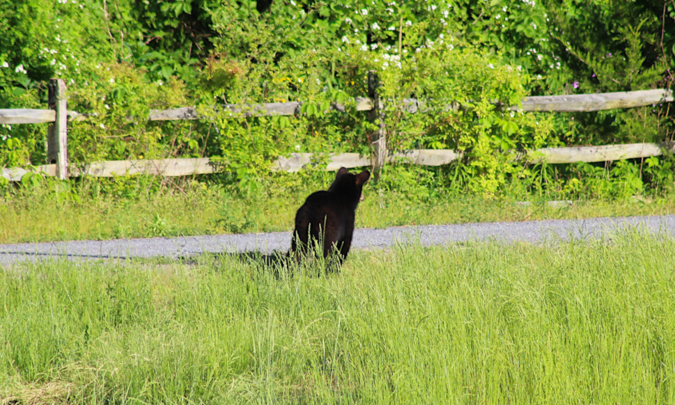Now for the unexpected visitor. This youngster showed up Tuesday evening. I don’t think it was a very old black bear as it wasn’t too large. It headed down the Rails to Trails trail for about 70 yards or so and came to an abrupt halt – perked it’s ears up and then reversed course.