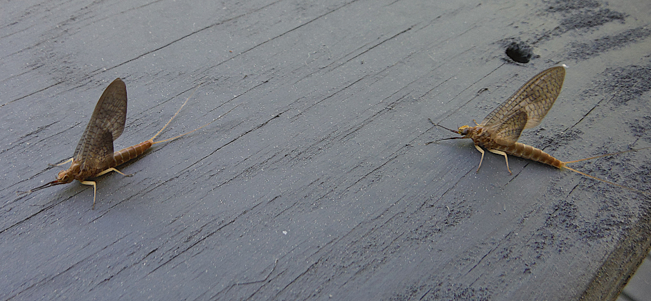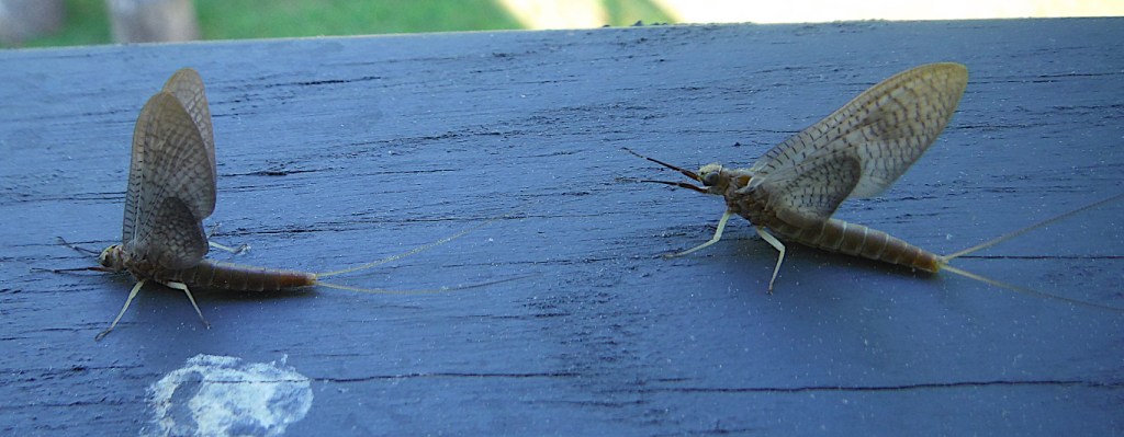 They appear to be both Slate Drakes (Isonychia bicolor) I think… their size difference was obvious. There was at least a half size, if not a full size difference. I believe both specimens were female.