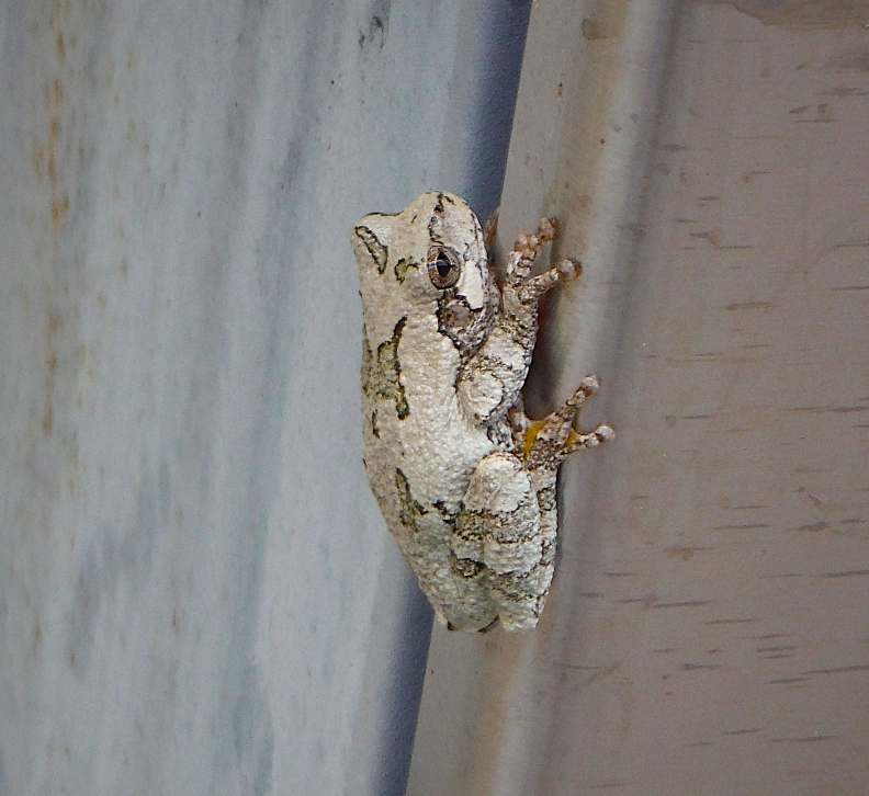 I haven’t spent a lot of time investigating what the green frog is in the images above. But I did see where the Easter Grey Tree Frog could be a bright green according to https://therouge.org/eastern-gray-treefrog/. The green one was hanging out on our basil plants. Then when my daughter and I approached, it bolted to the outside of the container holding the basil. The grey one was clinging on the steel door of the grill. Perhaps the green one was just trying to fit in?
