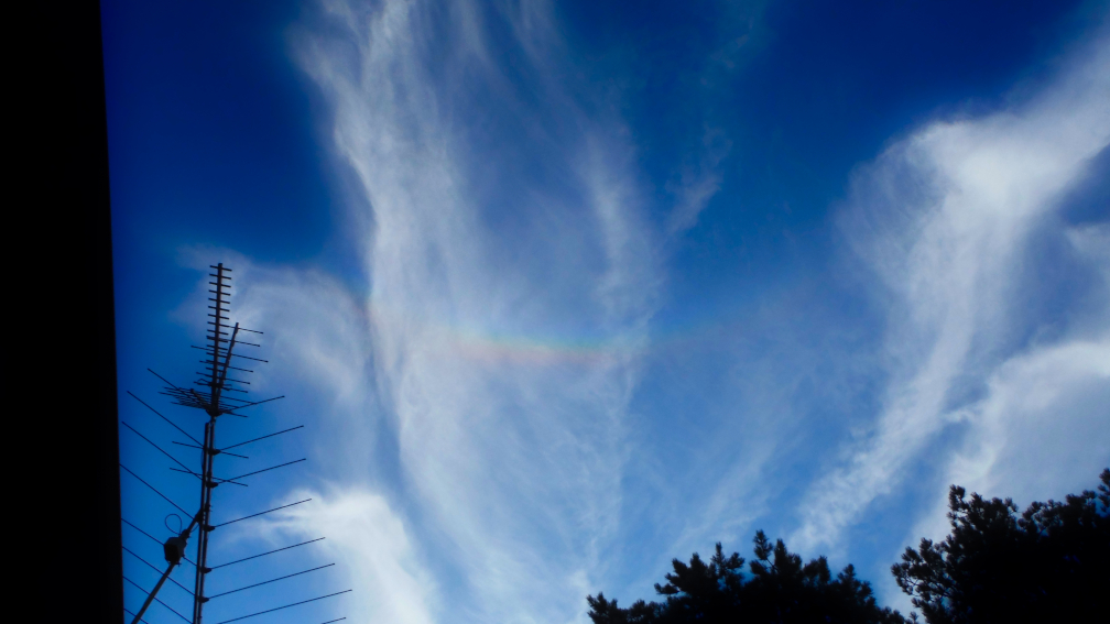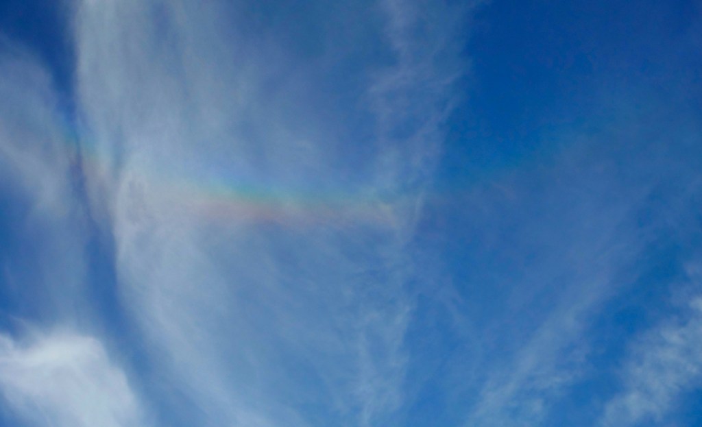 Just googled rainbow in clouds and found this reference – a circumhorizon arc. Maybe that is what I saw this evening.