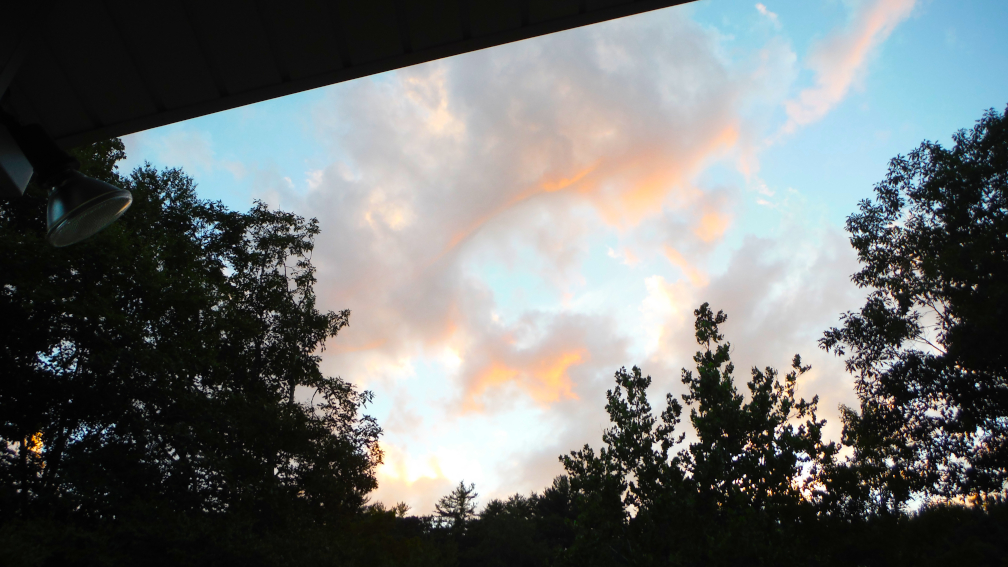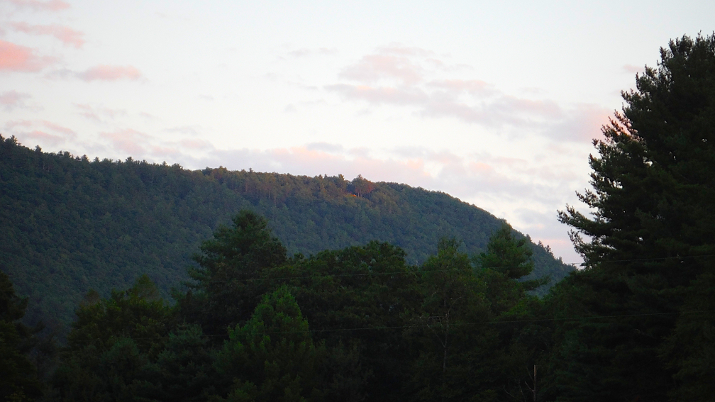 The clouds had pastel pinks and almost an orange hue to them. Above, the last bit of sun for the evening just about to go over top of the mountain.