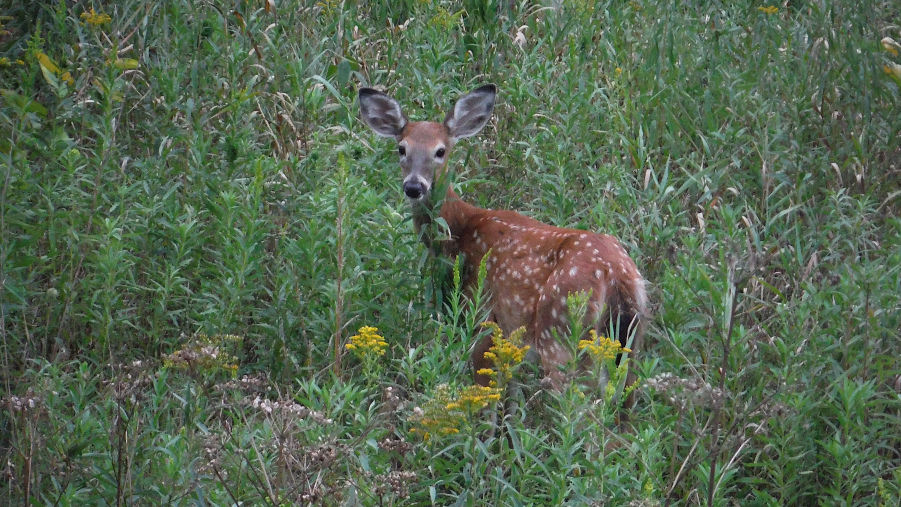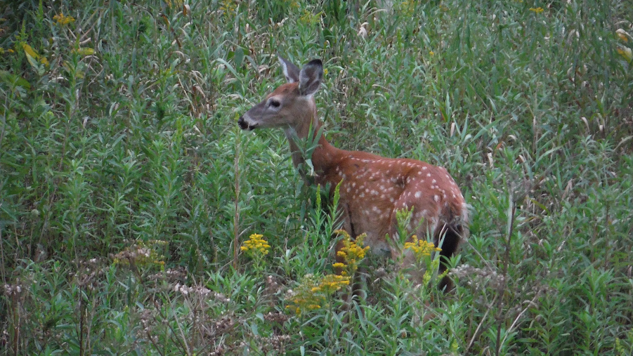 Saw this guy or gal! I must have been about 20 feet from the very calm beast – it wasn’t startled at all! Looks like a good healthy fawn – in full spot. The spots should fade soon.