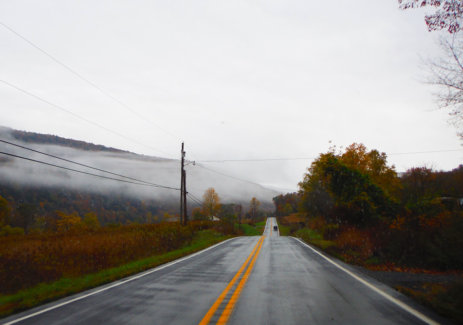 You know, it may have been a foggy, drizzly, misty, dreary morning but so what! It has been so dry for so long this past summer that I will not complain about having to drive in such conditions as I know the good it is doing. The problem is, we need this to happen on a regular basis in order to make any improvement. I’ll try to be careful with what I wish for (as.. like the past two years I swore off precipitation). However in this case, it was a great drive and really pretty scenery along PA 120.