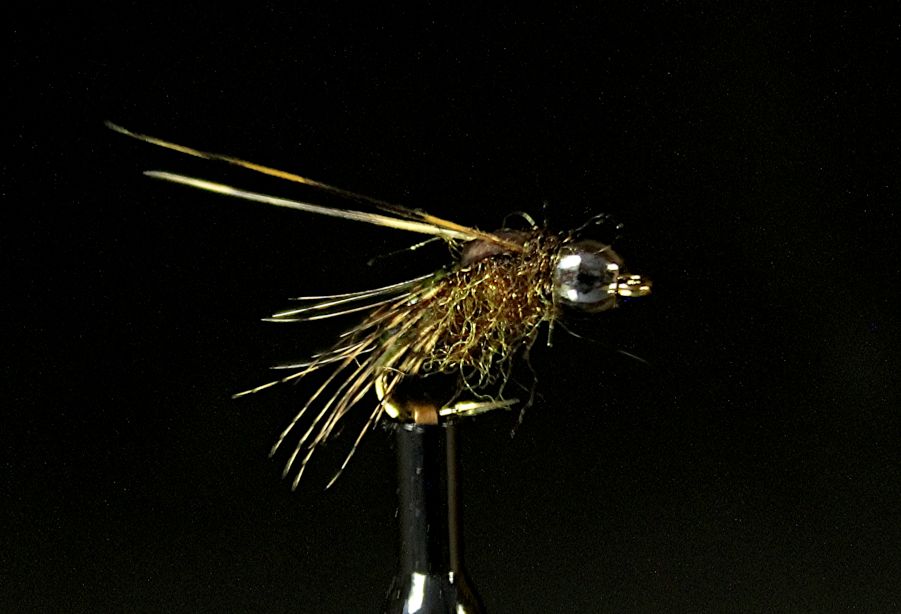 Hard to see but it uses latex for the abdomen, then partridge for legs along the sides. More latex for a ‘wing case’ ( I know… caddis don’t have wing cases… this tie just seems to have it) – dubbing a thorax, adding some antenna and tying down the wing case that shouldn’t be there on a caddis. It’s using a tungsten bead like the Catnip above and I’m considering tying heavier versions like the flies above. I’d lash down several turns of flattened lead in the thorax are before dubbing to accomplish this.