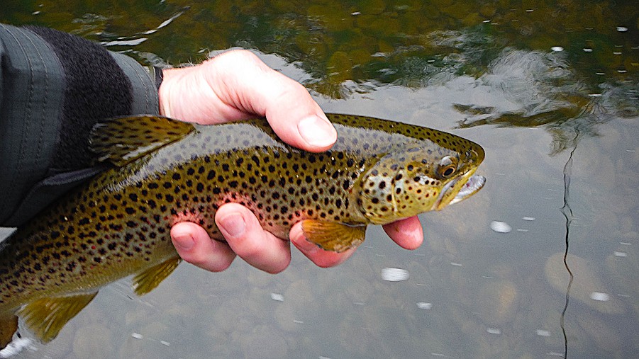 I fished in Pine some 3-ish days ago – tug one fish. Let me explain – ‘tagging’ a fish (or the past tense ‘tug’) to me is when the fish has decided to accept the offering, it engulfs the offering, I ‘set’ the hook, the tug is felt for a second or two, and the fish promptly slips off. Tagged one yesterday too. And I went up Slate two days ago and only had the interest of one little brookie. Water temperature was 52 degrees, bright sun – bluebird day. I did have this fellow/gal land on my hand.