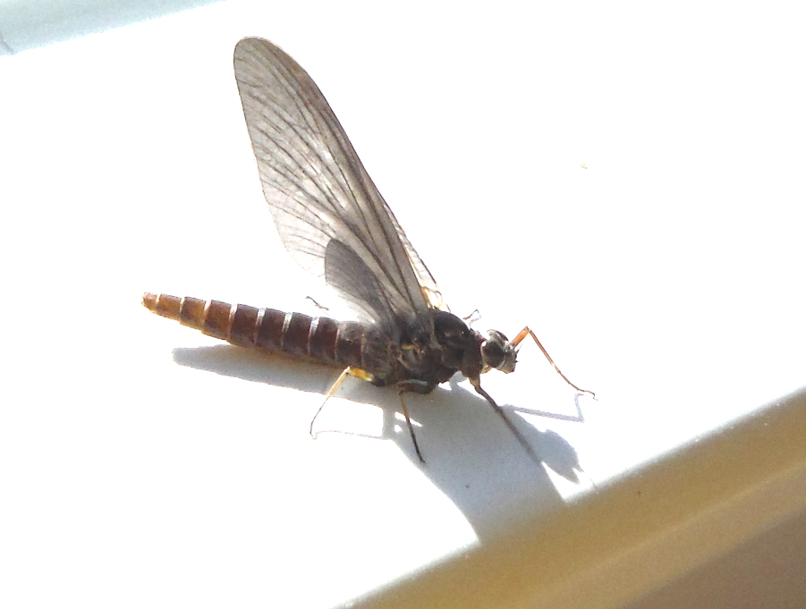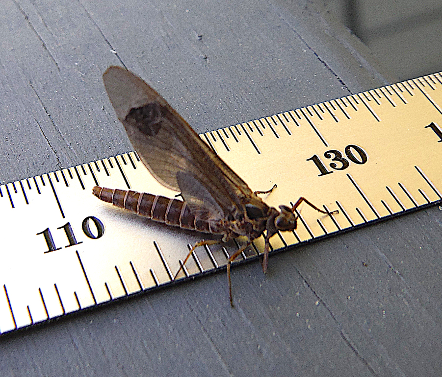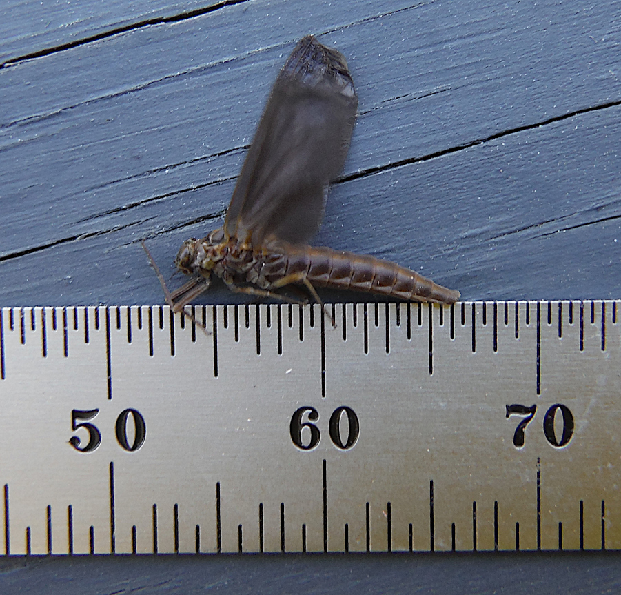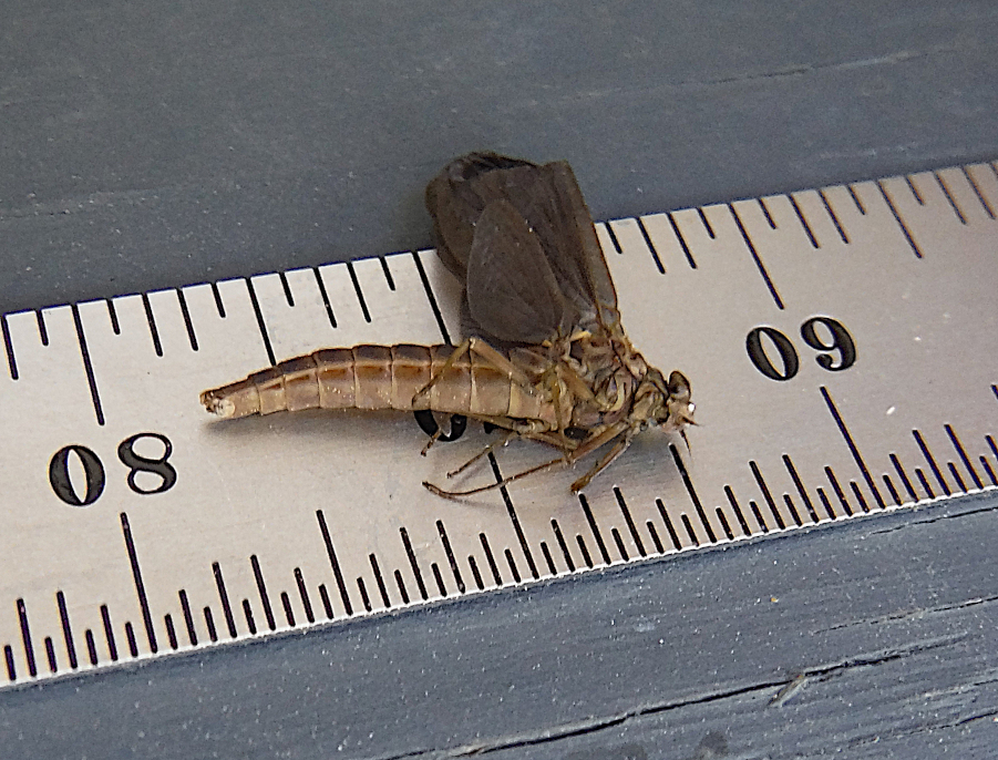Instead, there’s a prisoner in it. The captive is questioned and interrogated promptly. These pictures were intentionally over exposed to try to make the color of this fly more apparent. It had a dark dun wing, and as ‘The Neighbor’ said: “It’s a size 12!” – I agreed. The body would seem to look similar to an ISO but the fore-legs do NOT have the distinctive color change – the white from the ‘white-gloved-Howdy’ moniker. And this is WAY too early for them to be hatching… isn’t it?!? The body was distinctly a variation on brown and dark tans. My observations did not really detect much if any olive.