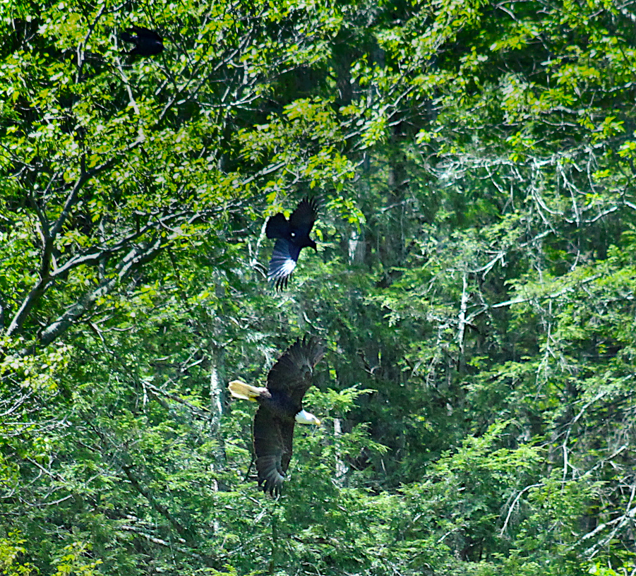 Friday morning I heard a murder of crows raising a ruckus. I have come to recognize that when more than a couple of crows are squawking, they are displaying agitated behavior usually directed toward what they consider a predator. Here along Pine Creek that means an eagle to me. I saw several crows, a few days prior to Friday morning’s episode, within a couple feet of an eagle perched in a tree across Pine Creek. They persisted in swooping closely to the eagle all the while vocalizing with intensity.