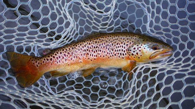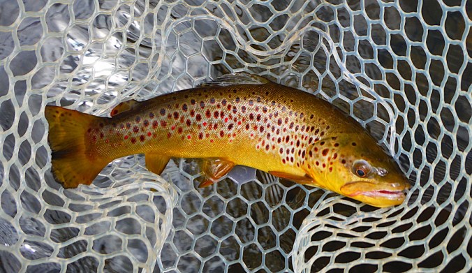 Then, late into the evening I hook into a fish that rolls a few times and I can see that it’s color is especially orange! I could tell it was a heavy fish and knew not to horse it around too much. I really wanted to bring this fish to net and hand! It didn’t particularly fight with as much vigor as some I’ve caught that were probably a little smaller – but it was so heavy that it put a strain on the tippet, leader, the rod and my hand and arm. After what felt like a long time (actual time was probably 50% less), I brought it to net. Mr. ‘Plancknow’ had waded down to me to see the fish – I did have a witness on this one. I held the fish to the net opening and estimated it was between 19″ – 20″.
