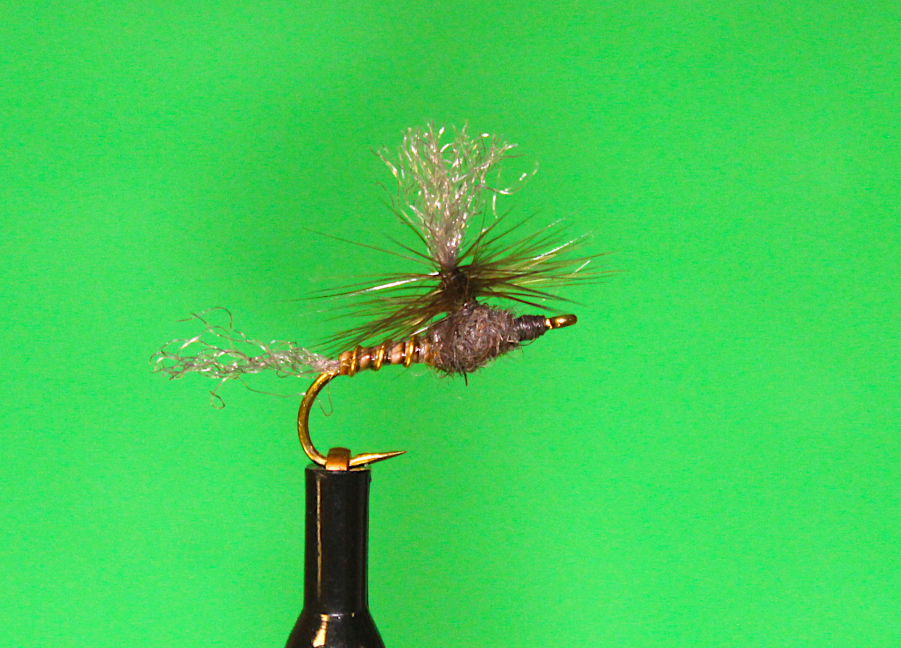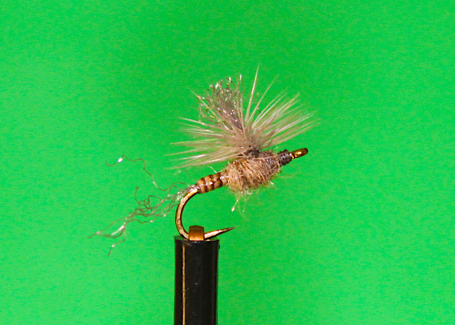 A casual glance at these last 2 images might cause someone to think they are the same, or nearly the same, size. You’ve got to use how big the clip holding the fly looks relative to the hook/fly in order to get a sense of how large/small the fly really is. That Blue Quill is 2 sizes smaller (an 18) than the Quill Gordon (a 14). Again, they’re tied on Tiemco 101s.