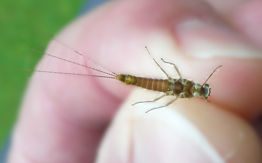 Body is close to 5 mm, the tails are at least 5 mm and I think longer. Wings I’m guessing are greater than 5 mm also. I believe this was a female as I do not see any claspers and the eyes are not really large, usually two things that can depict male from female in mayflies.