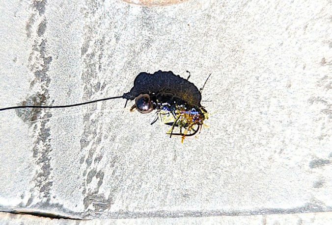 The report I got was that this nymph was used as the dropper and another fly was on point. This fly caught 3 fish this past weekend and the point fly 1. I’d say it’s tested and passed with flying colors (That’s an olive-brown hareline UV micro chenille, hareline UV micro chenille black, any sort of ‘wing’ casing material you prefer lashed down with 0.009 mono, tungsten bead-probably a Ø 5/32″, and black Veevus thread – 12/0 or 16/0, probably a size 12 scud style hook).