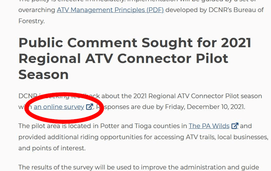 Click on the link circled in red and you’ll be directed to the survey. You only have till Friday, December 10, 2021 to leave your comments. We apologize for the late notice of this but felt we needed to communicate this urgently in order to give you the chance to express how you feel about the ATV Expansion program the DCNR has implemented.